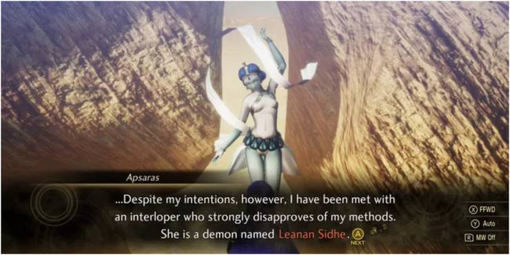 Apsaras Or Leanan Sidhe In Shin Megami Tensei 5 One of the first quests in Shin Megami Tensei 5 is a choice-based quest found in Shiba Park, which adds to the replay value of one of 2021's biggest JRPGs. This quest is known as "The Spirit of Love," and it involves the protagonist encountering a female entity known as Apsaras. She will assign the protagonist the task of tracking down and eliminating her adversary, Leanan Sidhe. Alternatively, Leanan Sidhe will try to turn the tables on Apsaras in order to initiate the Water Nymph quest, leaving the player with the option of siding with either of the Femme Race Demons. As a result, one of them will join the party while the other will fight.